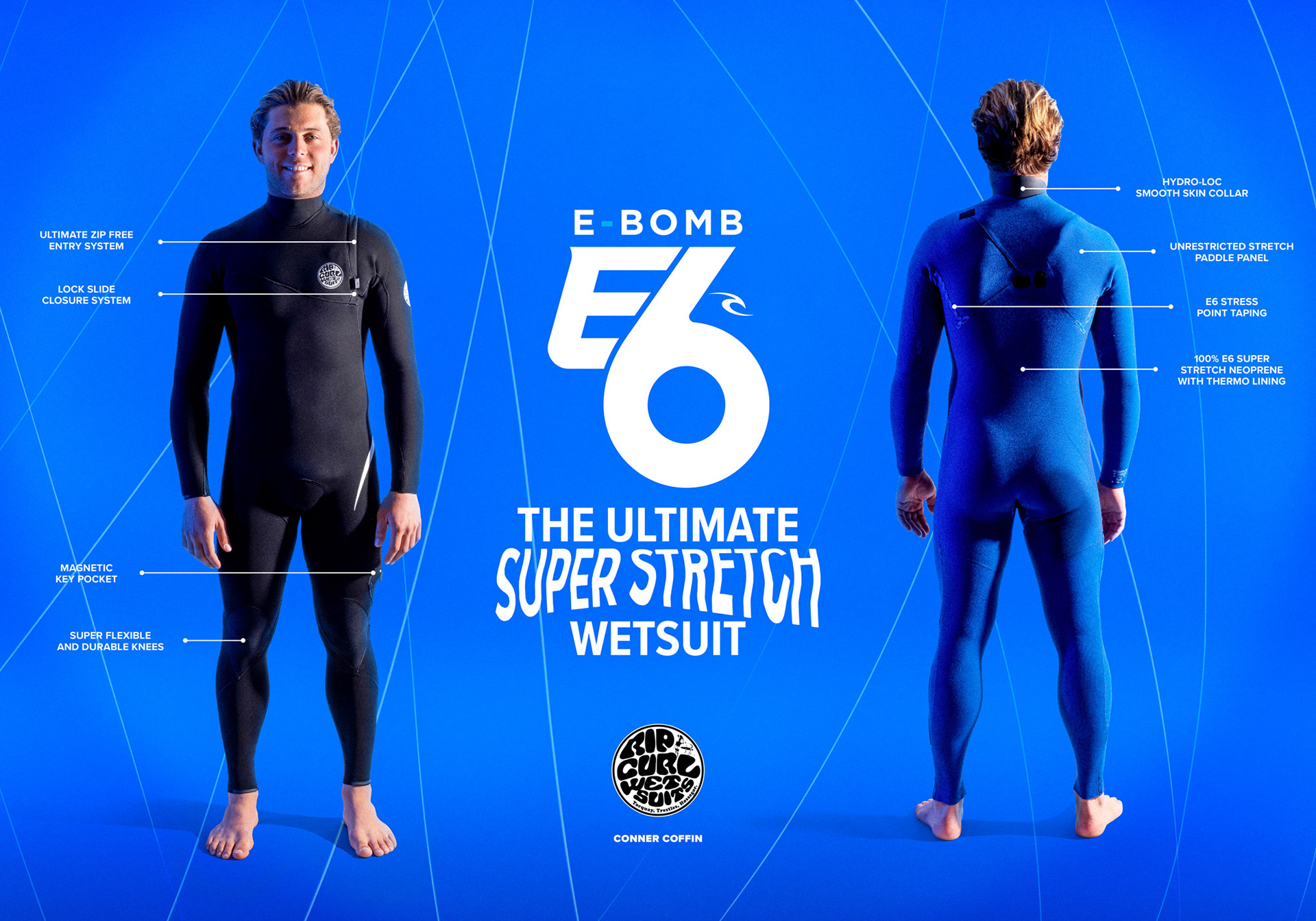 Project Overview: A global campaign for the E6 E-Bomb – Ultimate Super Stretch Wetsuit. The Ultimate high-performance wetsuit contains E6 super stretch neoprene. Delivering massive stretch, a smooth, streamlined fit & protection from the cool water. Here I concepted and created end-to-end a fully integrated product campaign. Artwork design included point of sale, packaging, print advertising, then all the way through to digital assets for social media, website rollouts & EDMs.